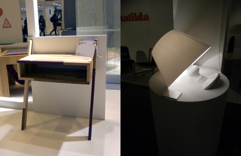 Jouant avec la loi de la gravité, le mobilier sur 2 pieds qui se pose contre le mur dynamise les intérieurs. Une invitation à s’échapper de notre environnement de plus en plus réglé par des matrices horizontales/verticales? Console design Sara Kele en bois récupéré auprès des scieries. Lampe « Titanic » du designer Charles Trevelyan, éditions Matilda.