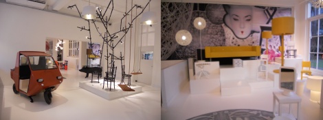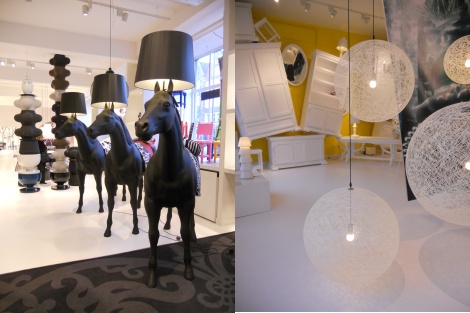 Une expérience riche en émotions. Dès l’entrée une voix chuchote la bienvenue dans cet espace mis en scène par Marcel Wanders. Après la suite spectaculaire des chevaux/lampes des designers Front, se succèdent plusieurs propositions d’ambiances qui agencent les produits de la collection Moooi de façon très libre. Code couleur : Noir et Blanc, rehaussé de Jaune.