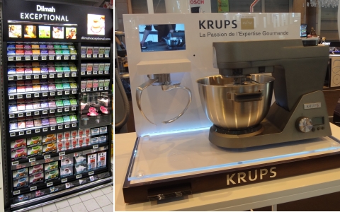 Que ce soit pour les thés Dilmah ou pour le dernier robot Krups, la plv est à usage multiple ! Réalisé par Pilotes, ce linéaire présente les gammes de thés premium et éthiques de façon claire et didactique. Un espace vitrine intégré propose une mise en scène d’ambiance avec théière, de quoi projeter le consommateur dans un moment de dégustation fictif. Krups de son côté a opté pour la mise en ambiance digitale pour son robot sélection Lenôtre. Une vidéo diffusée sur l’écran intégré est le support idéal pour une démonstration par un grand chef. Technologie qui ne néglige pour autant pas le bon dépliant, à la disposition des consommateurs curieux dans un petit tiroir situé à l’avant. Réalisation Berzan plv.