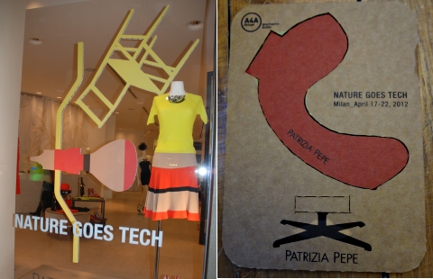 Les vitrines de la boutique de Patrizia Pepe arborent des silhouettes en cartons alvéolaires imaginées par les A4Adesign, éco-designers spécialistes de ce matériaux. Sous la signature « Nature Goes Tech », la créatrice a souhaité donner un ton écologique à sa visibilité durant le salon de Milan.