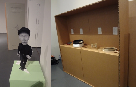 Idem pour la signalétique et le mobilier de présentation du travail du designer Roberto Giacomucci qui a été exclusivement réalisé en carton. Une scénographie brute, sans chichi signée Marco Ferreri, des caisses en carton à la verticale ou horizontale, en hauteur ou en cube … et les notes explicatives sont simplement punaisées sur le carton.