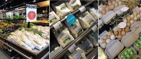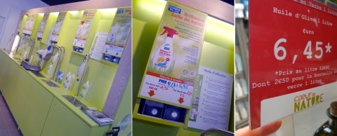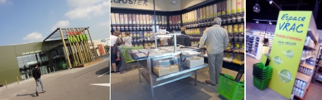 Quelques photos prises lors de la visite de Coeur de Nature, tout nouveau concept magasin à Brétigny 100% bio. En guise de bienvenue, le rayon thé est placé proche de l’entrée, une bonne idée pour donner une ambiance olfactive sans artifice. Ce qui représente certainement une révolution dans le secteur, aucune grande marque du circuit GSM traditionnel n’est présente, voire on se passe même de marques. Auchan a transposé ses expériences du concept magasin vrac à Aubières, dont notamment « l’espace vrac » des produits d’entretien, particulièrement pratique. Que ce soit lessives ou huile d’olives, le consommateur choisit d’acheter le contenant+le produit ou le produit seul. L’identité du magasin signée Saguez joue avec les codes ‘nature’ en toute complicité, avec petits messages et clins d’oeil. Le marchandising et la promo sans être absents sont discrets, laissant au maximum le produit s’exprimer.