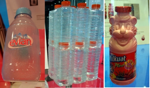 Dans les innovations packaging présentées par les exposants sur le salon Creativ’Pack, de curieuses bouteilles interpellent. Le prototype réalisé par mmbpro consiste en une bouteille d’eau en format nomade qui s’attache à la ceinture, adapté à la course à pied. Le défi réside dans la réalisation de fines gouttelettes sur ce matériau souple et transparent. Sidel présentait son nouveau principe de bouteille emboitable, Pack and Stack, très astucieux : celui-ci permet un gain de place non négligeable lors du transport et du stockage, évite l’usage intercalaire, tout en assurant une bonne stabilité. Décalé dans le paysage du packaging, les moulages plus fantaisistes sont, selon l’agence In Spirit, particulièrement appréciés sur le marché asiatique.