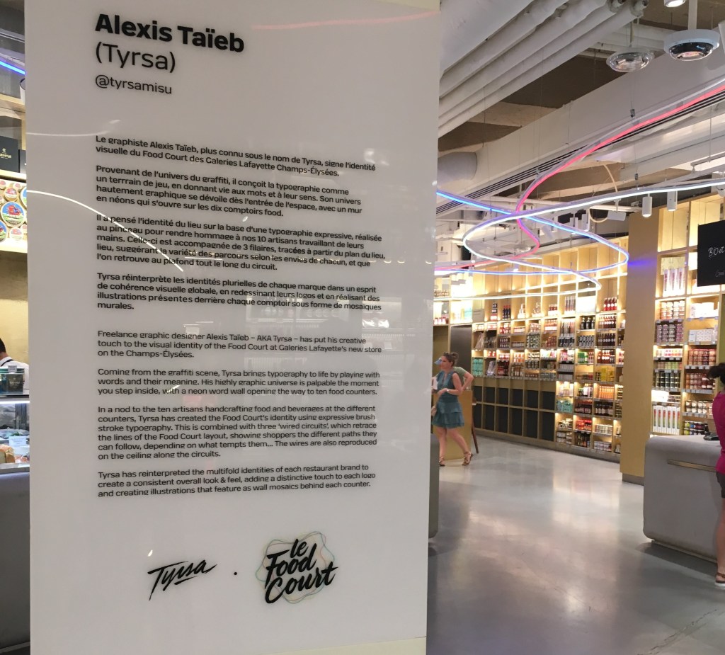 Dès l’entrée par un tunnel de spots lumineux, les Galeries Lafayette annoncent que ce temple, jadis une banque, un megastore culturel, est désormais dédié à l’expérientiel. Décor, merchandising et même la signalétique sont des oeuvres d’art au service des marques ainsi magnifiées. Une intention quasi muséographique qui est soulignée par des panneaux expliquant les gestes créatifs remarquables (par exemple la signalétique artisanale du foodcourt signée par Alexis Taieb (tyrsa)).