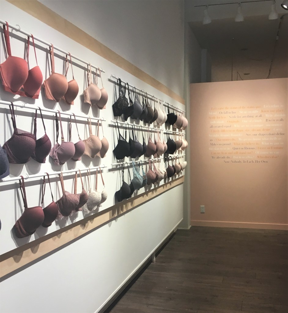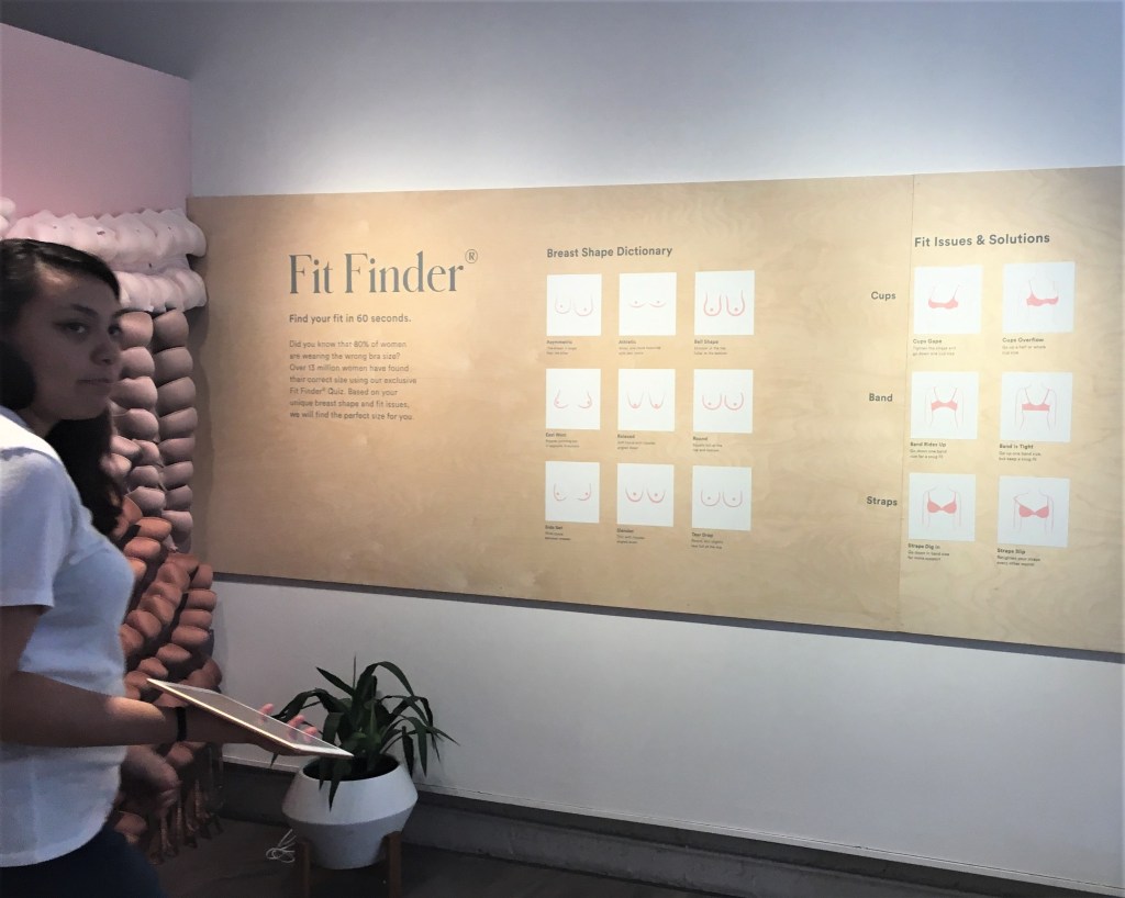 Thirdlove, start-up lancée en 2013 s’est fait connaître pour oser challenger Victoria’s Secret sur le marché du soutien gorge. Avec une offre déclinée en 78 tailles (déclinées en 7 modèles et une multitudes de couleurs) ce spécialiste a pour ambition de proposer le parfait soutien gorge pour chaque femme à partir d’un configurateur en ligne intelligent. Jusqu’alors distribué exclusivement en e-commerce, ThirdLove a inauguré un pop-up cet été à New-York hybridant l’expérience digitale avec l’espace de vente physique. Exploration. Le parcours shopping phygital commence par un entretien, installée confortablement sur un canapé et entourée des innombrables modèles. La conseillère, munie d’une tablette digitale, passe en revue l’ensemble des questions du configurateur intelligent afin d’identifier ma morphologie et cerner les besoins spécifiques que je pourrais avoir. Heureusement que la conseillère m’a guidée à travers ce questionnaire assez intime, pour aboutir à la recommandation d’une taille. Je passe l’étape suivante avec une personal styliste avec qui je choisi le modèle le plus adapté sur le mur de présentation. Une fois installée en cabine, on me dépose le modèle choisi à ma taille supposée. Oui supposée, car j’ai découvert que je fais partie des 80% de femmes qui portent un soutien gorge à la mauvaise taille, et le configurateur même intelligent en début de parcours n’a pas corrigé ce biais. Une erreur qui n’a par contre pas échappée à la personal styliste qui m’a vite aiguillée vers la taille parfaite. Une expérience convaincante, je n’ai pas résisté à l’achat.
