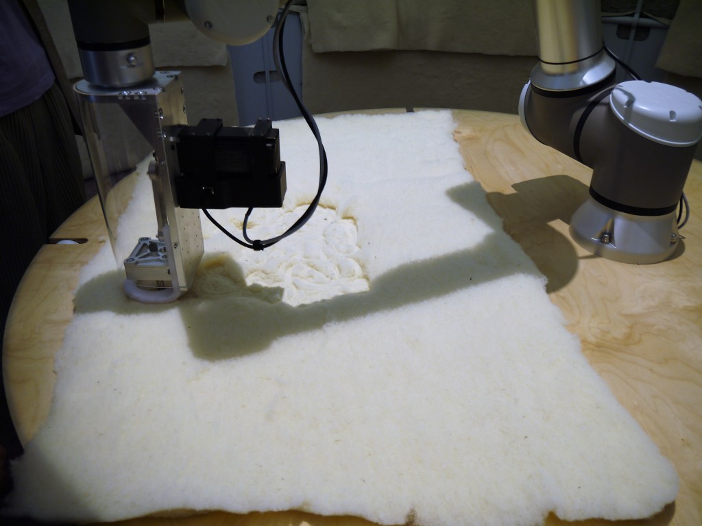 Désapprendre à jeter. Comme le souligne Justin McGuirk, commissaire de l’exposition « Waste Age » du Design Museum de Londres, après la deuxième guerre mondiale les classes moyennes ont dû apprendre à jeter. De couteuses campagnes publicitaires ont vanté les bienfaits hygiéniques, la facilité d’usage, la libération sociale de la nouvelle société de consommation. Aujourd’hui, nous arrivons à un point où nos déchets deviennent intolérables. Et il ne s’agit pas que des poubelles des consommateurs, quantité négligeable du problème. C’est au contact d’amis éleveurs de moutons que la jeune designer Carolin Schelkle constate que leur laine est jetée. 80% de la laine européenne est détruite faute de filière pour transformer cette matière qui ne répond pas aux standards de la confection. Celle-ci privilégie la laine mérinos importée de Nouvelle Zélande, où elle est produite en masse et nécessitent un long et énergivore processus de transformation. Un défi que Carolin Schelkle relève en développant un processus court de feutrage d’une laine brute et locale à l’aide de robots programmés pour appliquer une variété d’effets de matières et de motifs.
